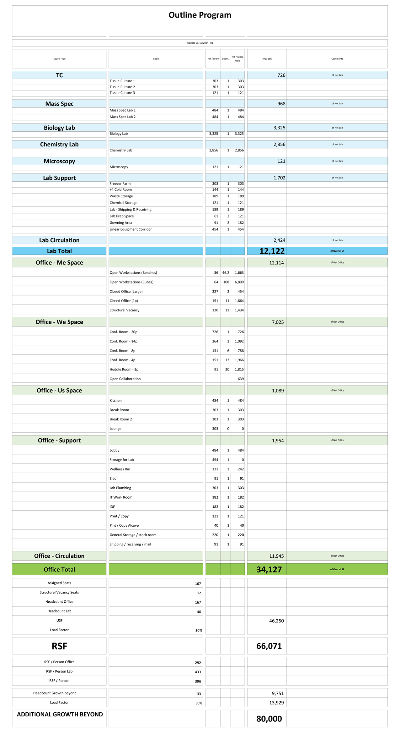 A qualitative and quantitative planning process for defining the spatial requirements prior to, or in junction with, a real estate transaction, construction project or meaningful change in the form and function of a workplace. Elements of space programming may include: